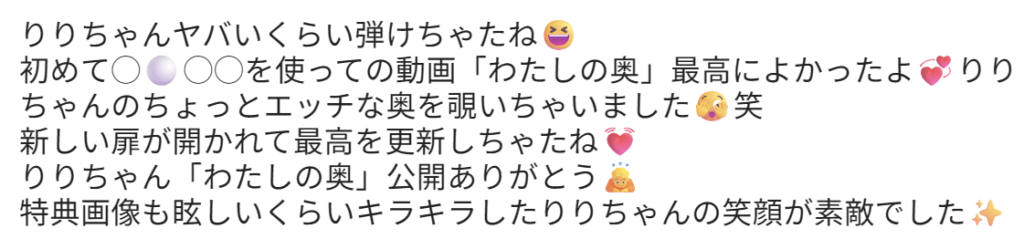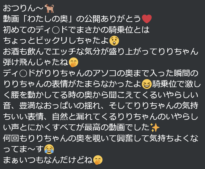 また、動画「わたしの奥」かなり過激な映像ですけど勇気をもって公開してくれてありがとうございました✨💖りりちゃん🐕の秘密の一面を観ることが出来ました🙊これからもりりちゃん🐕も楽しんだ範囲で過激な映像をお願いします🤩過激な内容でもリリーズは引くことはないので、安心してくださいね🥰いつでもりりちゃん🐕の味方です👌そして応援もしていますよ📣